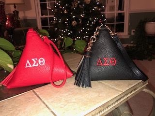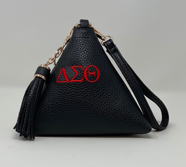 Black triangle bag with red DST symbols