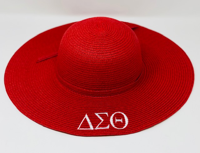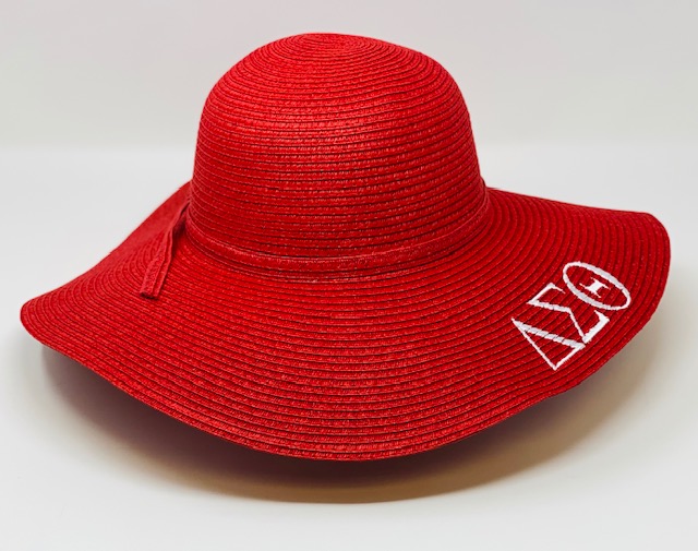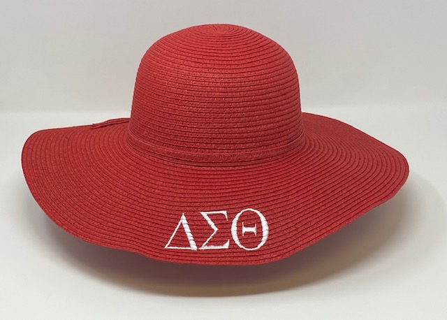 Red mid brim straw hat with white DST symbols