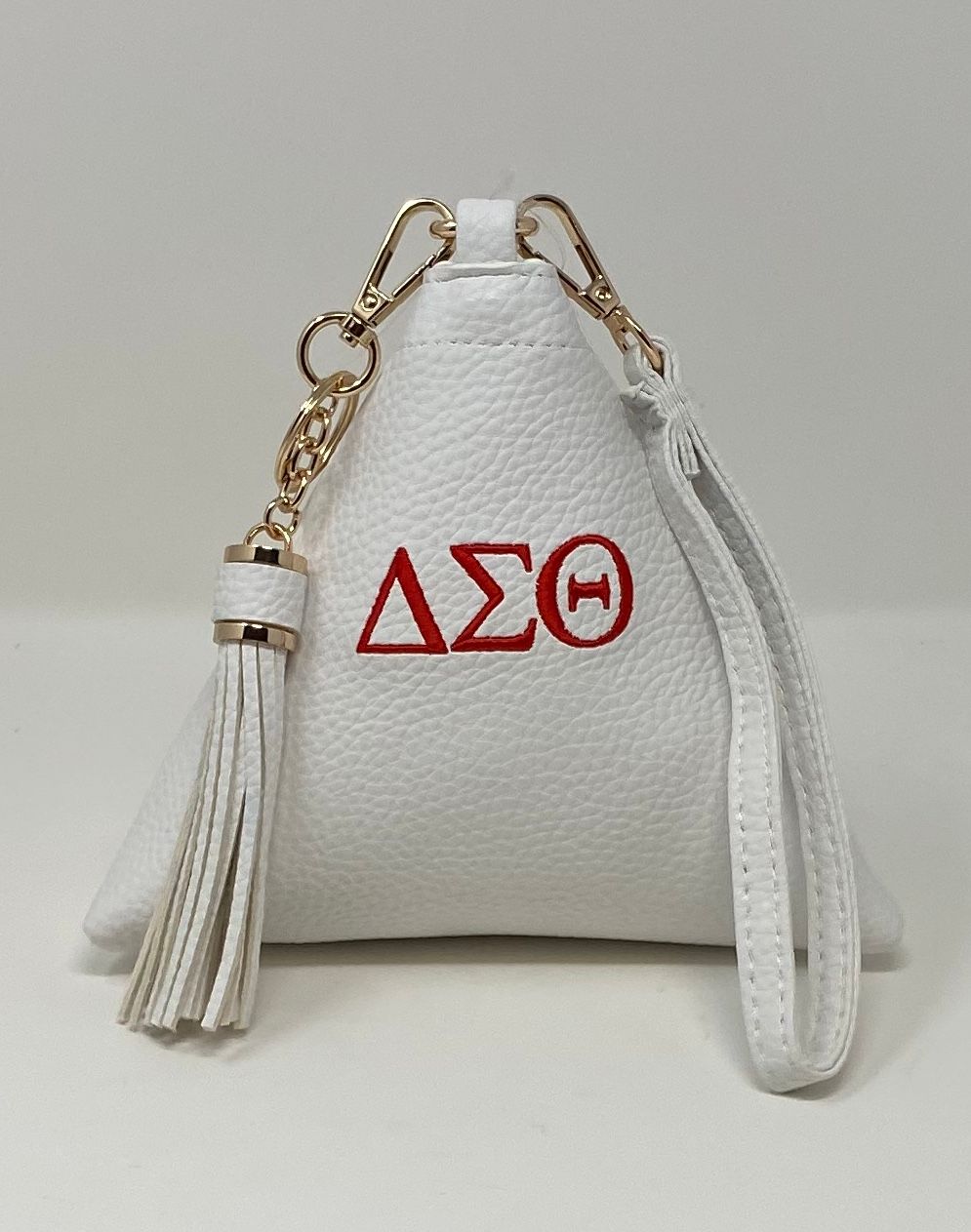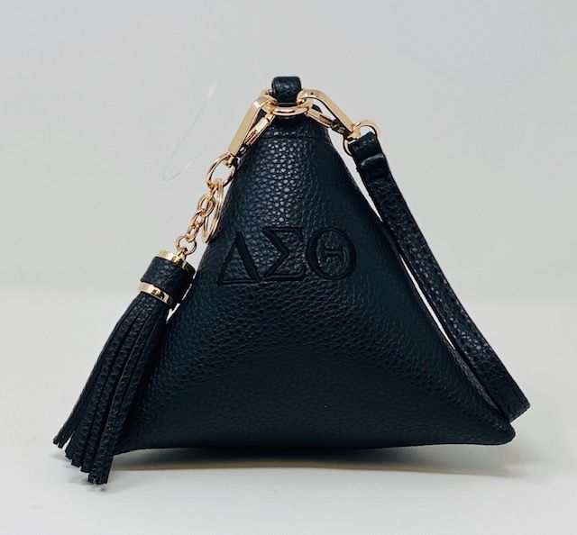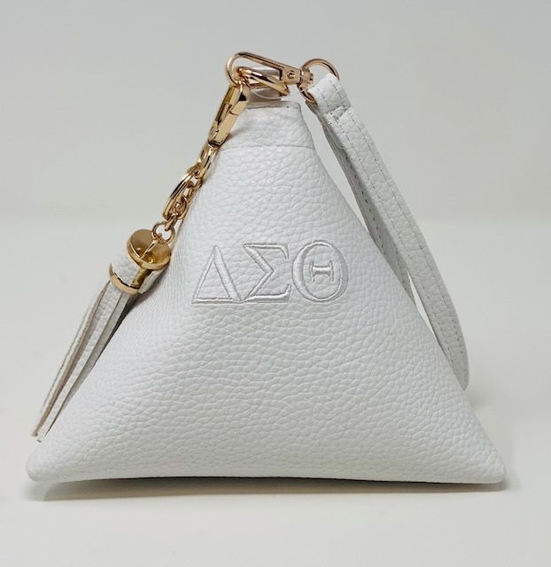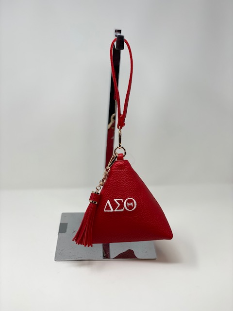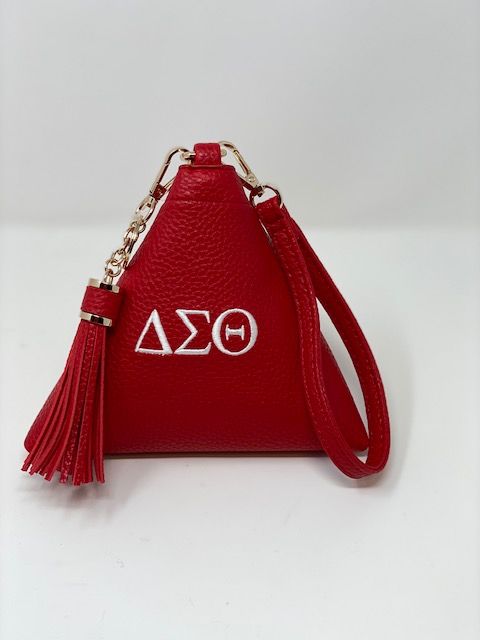 Red triangle bag with white DST symbols