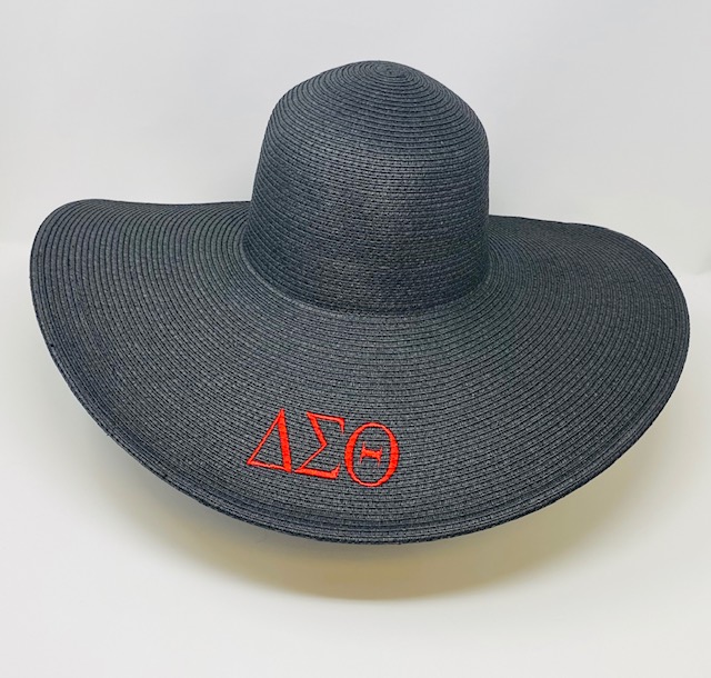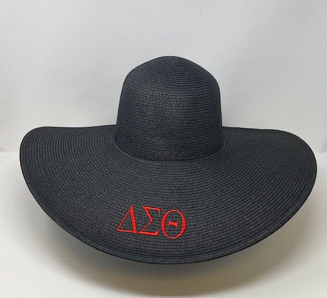 White wide brim straw hat with red DST symbols